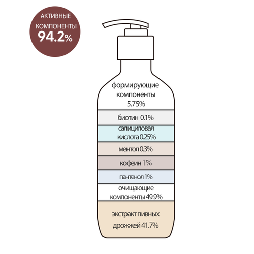 Шампунь на основе 41,7% экстракта пивных дрожжей, салициловой кислотой и 1% кофеина глубоко восстанавливает волосы, укрепляет волосяные луковицы, питает и увлажняет. Эффективно очищает, не нарушая воднолипидный баланс, улучшает защитные функции, устраняет ломкость и сечение. Благодаря слабоксилотному pH 5.0-6.0 шампунь не сушит кожу, поддерживает оптимальный уровень увлажненности и восстанавливает кожу после негативного воздействия жесткой проточной воды.