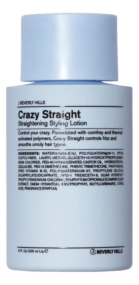 Лосьон для выпрямления волос Crazy Straidht Straightening Styling Lotion от J BEVERLY HILLS содержит: Water, Polyquaternium-Ll, Vpna Copolymer, Lauryl Methyl Gluceth-10 Hydroxypropyldimonium Chloride, Peg-40 Hydrogenated Castor Oil, Hydroxyethyl ceLlulose, Peg-12 Dimethicone, Phenyl Trimethicone, Panthenol, Polyquaternium-37, Propylene Glycol Dicaprylate/Dicaprate, Ppg-L Trideceth-6, Guar Hydroxypropyltrimonium Chloride, Symphytum Officinale (Comfrey) Leaf Extract, Dm Dm HydantoiN, Iodopropynyl Butylcarbamate, Citric Acid, Fragrance.