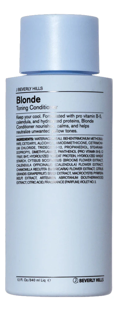 Тонирующий кондиционер для блондированных и осветленных волос Toning Blonde Conditioner от J BEVERLY HILLS содержит Water, Behentrimonium Methosulfate, Cetearyl Alcohol, Amodimethicone, Cetrimonium Chloride, Trideceth-12, Propanediol, Stearamidopropyl Dimethylamine Panthenol, Cl77007 Bht, Hydrolyzed Wheat Protein, Hydrolyzed Wheat Starch, Cytisus Scoparius (Broom) Flower Extract, Calendula Officinalis (Calendula) Flower Extract, Chamomilla Recutita (Matricaria) Flower Extract, Citrus Gran Dis (Grapefruit) Seed Extract, Macrocystis P