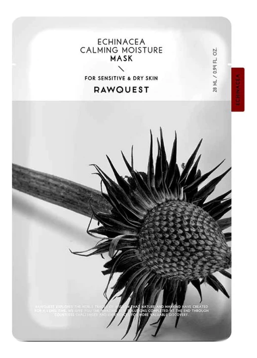 Для увлажняющего ухода за лицом, оживления и восстановления косметический бренд RAWQUEST предлагает использовать тканевую маску Echinacea Calming Moisture Mask с экстрактом эхинацеи и другими натуральными компонентами.